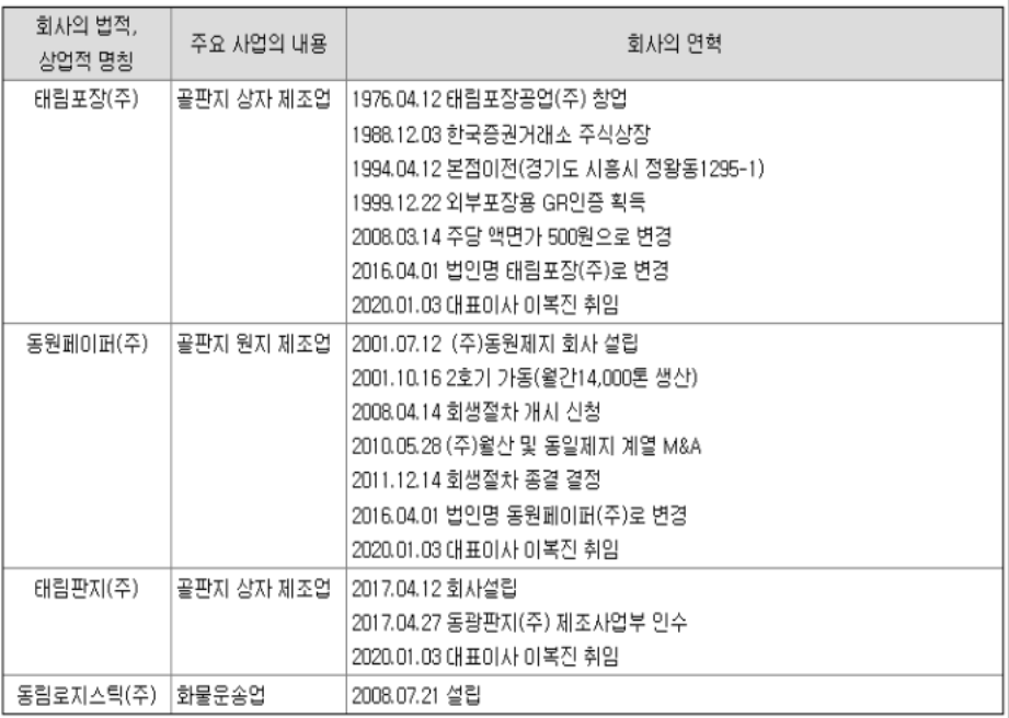 해당 태림페이퍼는 태림포장, 동원페이퍼, 태림 판 지 등 자회사가 있으며, 특히 동림 로지스틱(주)이 운송을 100% 지원하기 때문에 골판지 원지부터 상자 그리고 완제품 운송까지 모든 부분이 수익을 가지고 있다.