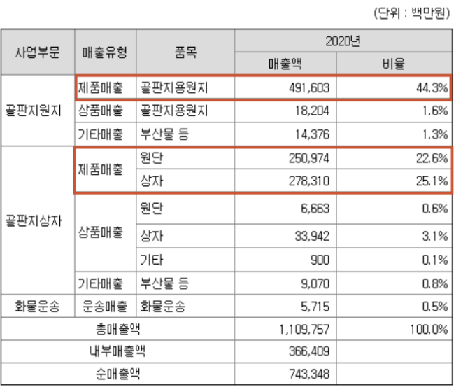 태림 페이퍼의 각 제품별 매출을 살펴보면 골판지 기업답게 골판지 관련이 70%를 넘게 나오고 있다.