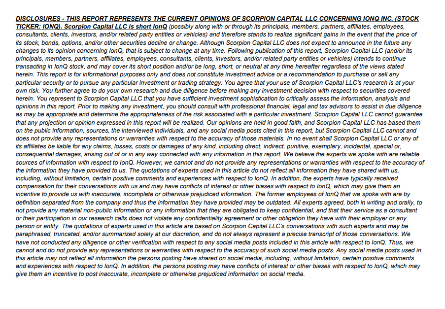4. 그리고 스콜피온 캐피털에서 써져있는 공개페이지에 대해서 보이듯 "Scorpion이 IONQ의 주가에 대한 평가절하는 재정적 인센티브가 있음을 인정하고, 보고서 내용의 정확성을 보증하지 않으며, 돈을 받은 전문가 및 전 직원들의 인터뷰 중 긍정적인 부분을 최소화하였음을 명시하고 있다.
