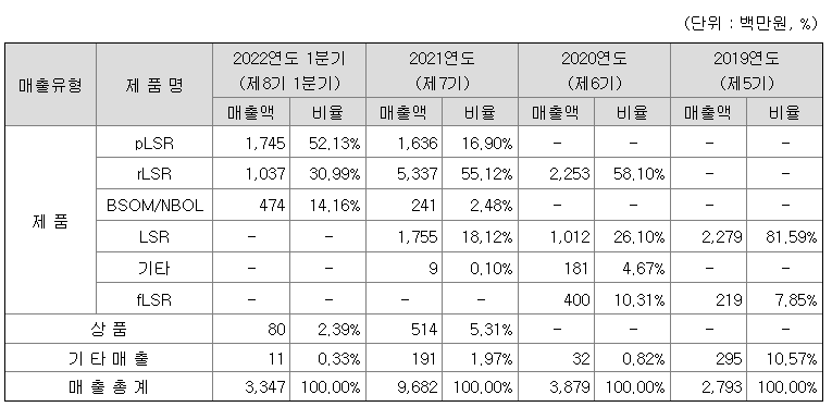 주요 제품은 pLSR와 rLSR의 비중이 80%를 넘게 차지하고 있으며, 해당 제품군을 설명하자면 크게 장비인 LSR 시리즈와 LCB, 장비 내 디바이스인 BSOM과 NBOL로 구분되며, 적용 사업분야는 첨단 반도체, 차세대 디스플레이 그리고 전기자동차 배터리 부문으로 구분됩니다.