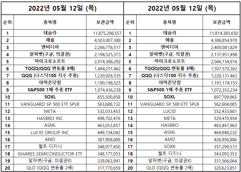 05월 19일( 5월 셋째주) 서학 개미 주식 보유 순위
