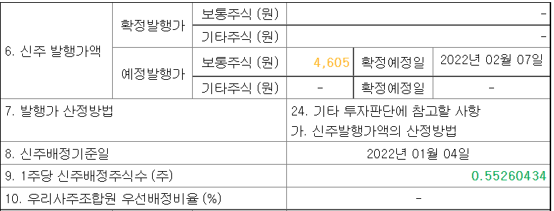 1차 발행가액은 4605원, 한주당 0.55260434 주를 곱하여 산정!