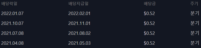 1주당 2.08 달러를 배당하며 분기별(2,5,8,11) 나눠서 배당금 지급