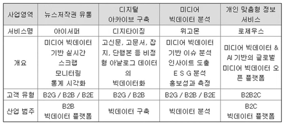 - 당사의 사업 영역은 미디어 빅데이터와 AI(인공지능)을 기반으로 하는 1) 뉴스저작권 유통 2) 디지털 아카이브 구축 3) 미디어 빅데이터 분석 4) 개인 맞춤형 서비스 등 4개 분야에 집중