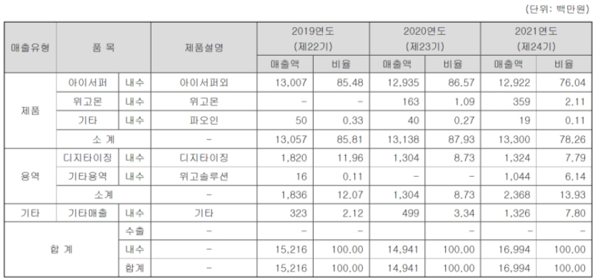 비플라이소프트의 주요 매출은 위 표에 보이듯이 19년도부터 21년 3년간 아이서퍼가 메인 상품인 것을 확인할 수 있다.