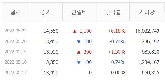 해당 이슈로 인해 최근 주가는 14,200원에서 15,250원까지 상승하였다가 금일(05/24 오후 2시) 기준으로 전일 대비 3.8% 상승한 15,100원에 거래되고 있다.