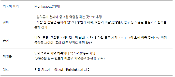Monkeypox 바이러스 감염에 의한 인수공통 감염병으로, 세계적으로 근절이 선언된 ‘사람 두창(천연두)’과 유사하지만 전염성과 중증도는 낮은 바이러스성 질환으로 사람 간에는 병변과 체액, 호흡기 비말(침방울), 침구 등 오염된 물질과의 접촉을 통해 감염된다.