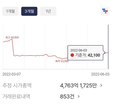3월 초까지는 6만 원 정도에 거래가 되었으나, 상장 철회 이후 3만원 초반에 거래가 되었다.