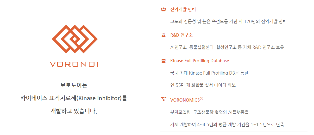 보로노이는 2015년도 송도에 설립된 바이오벤처기업으로 주요 사업은 신약 후보물질을 개발하는 연구개발 전문기업으로, 신약 후보물질을 전기 임상(임상 1상, 2a) 이전에 기술이전(License-Out, L/O)하는 사업을 하고 있는 기업이다.