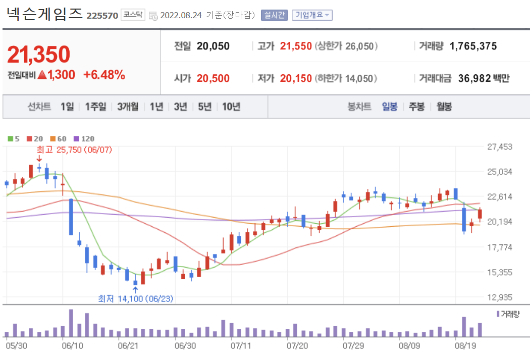 본론으로 넘어와 넥슨게임즈는 전일 종가 대비 6.48% 오른 21,350원이며 아래 일별 종가 및 거래량을 보면