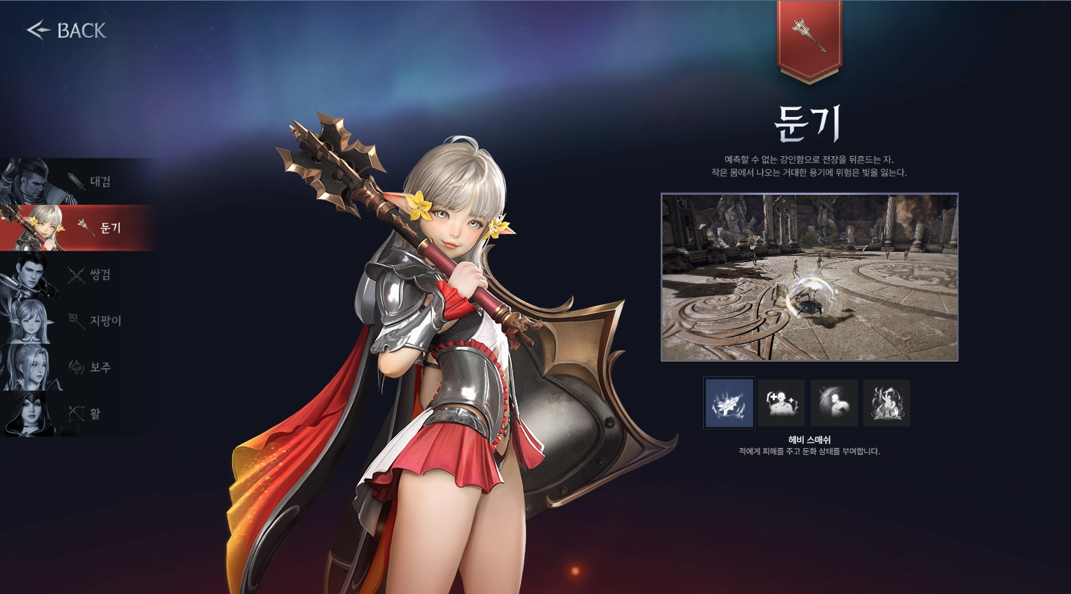 둔기-방어막,자힐,둔화,무적 스킬이 있어 파티사냥에 특화된 탱커 클래스