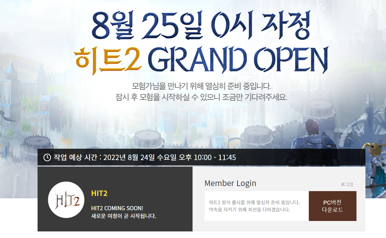 2022년 8월 25일 00시 기다리고 기다리던 히트2가 정식 오픈하게 됩니다.