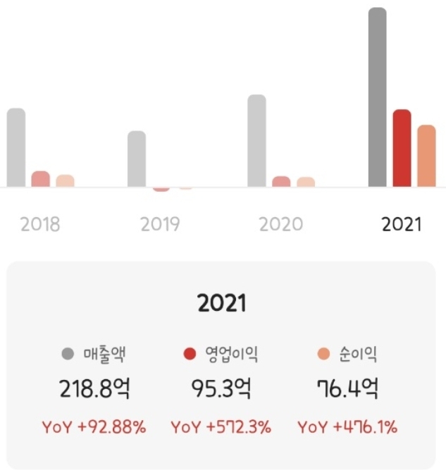2020년 매출은 약 283억 원을 기록하였고 전년도 대비 77% 매출이 증가하였으며, 국내 유니콘 기업으로 가치를 인정받은 기업입니다. 하지만, 인건비, 수수료 등 영업이익은 적자인 기업이기도 합니다.