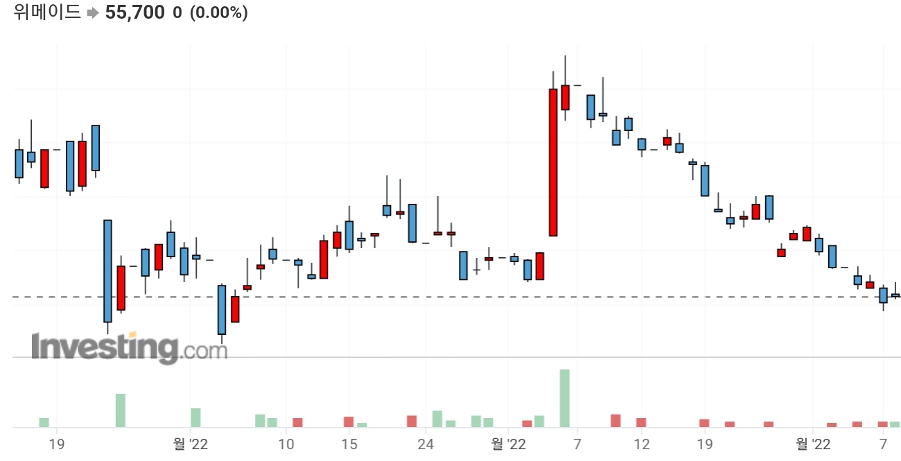 위메이드의 경우 게임회사로 미르의 전설과 같은 나름 인기 있는 IP를 소유하고 있는 게임회사로 P2E게임으로 지난해 주가가 많이 상승하였다가 최근 증시와 코인 관련 인기가 줄어들며 주가도 하락 중인 에 있습니다.