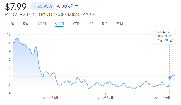 최근 주가는 11월 중순 고점 41.46달러에서 지금은 약 8달러까지 급락하였던 기술주입니다.