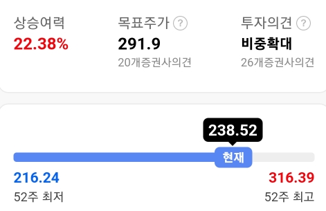증권사 평균 목표가는 291.9달러로 현재 주가 대비 상승여력은 22.38% 비중 확대 의견이 있습니다. (어디까지나 참고 목적)