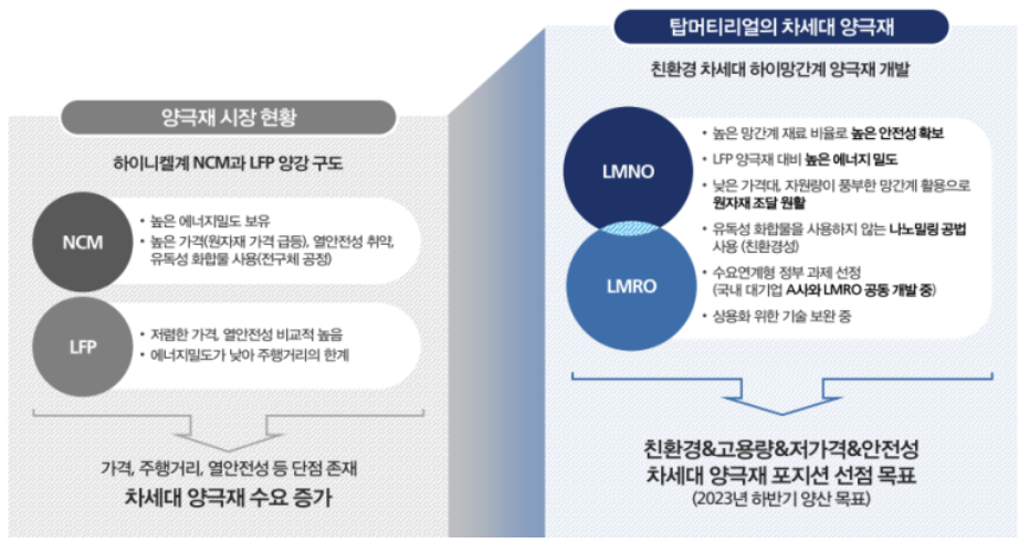탑머티리얼의 경우 친환경 차세대 하이망간계 양극재 개발을 2023년도 하반기 양산 목표를 하고 있다고 합니다.