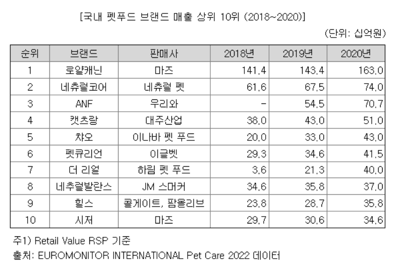 국내 펫푸드 브랜드별 매출 순위(2018~2020)를 확인해보면 아래와 같이 오에스피의 주요 제품인 ANF제품이 판매순위 3위인 것을 확인 할 수 있습니다.