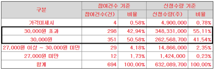 | 균등/비례(1주당) 경쟁률 2일차(16시 기준) | 균등 : 8.62주/ 비례 : 21.67:1 | 균등 : 2.34주/ 비례 : 2,038.17 : 1 |