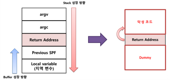 - 스택에 저장된 복귀 주소가 지역변수에 의해 침범당하는 공격